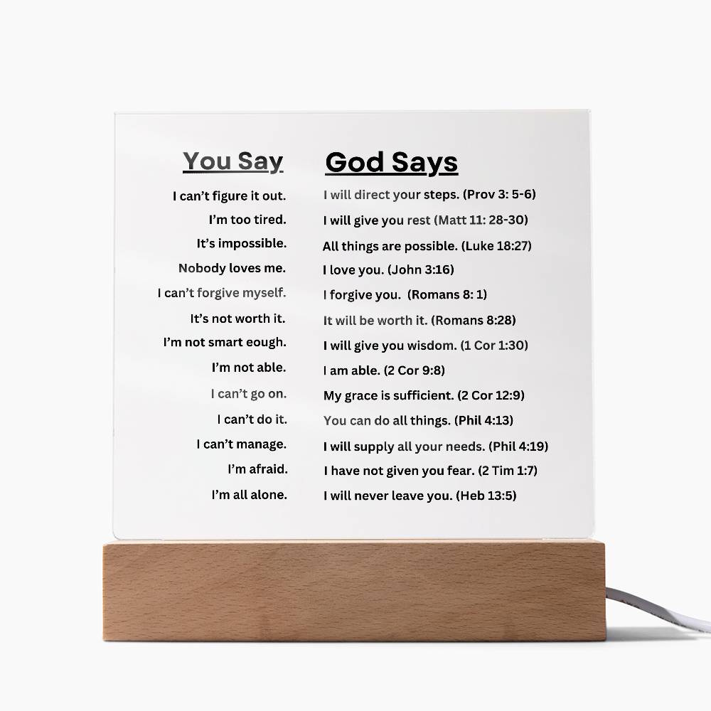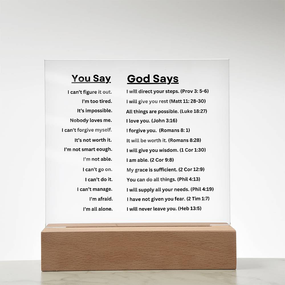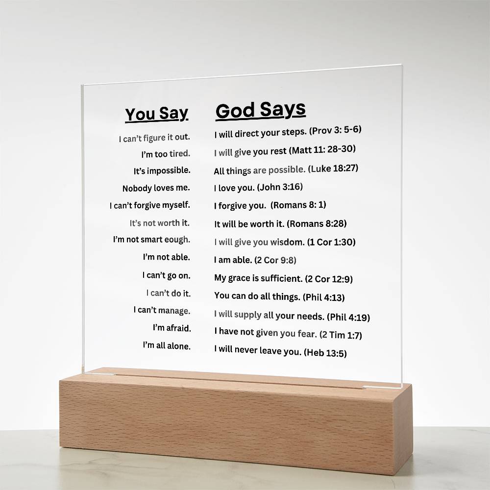 The *"You Say, God Says"* design contrasts common human struggles with God's promises, serving as a daily reminder of His unwavering truth and love. With phrases like "You say, ‘I’m alone,’ God says, ‘I will never leave you’," this plaque offers comfort and faith-affirming wisdom.